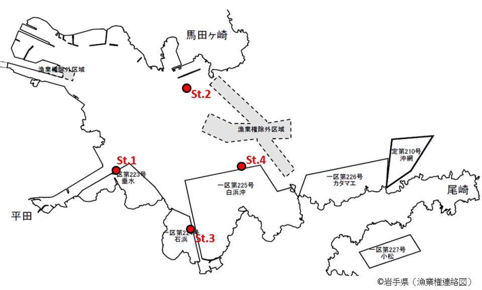※St.1からSt.4において透明度の観測や表層0mから海底上1mの水質を観測した。