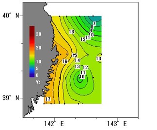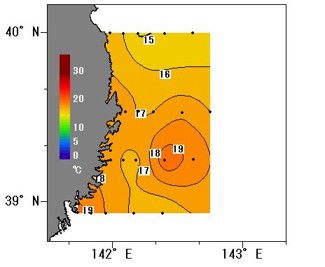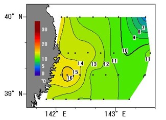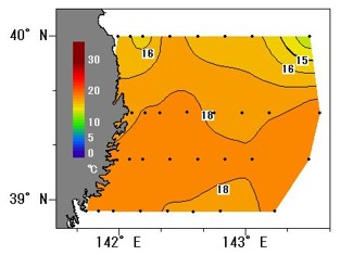 表面水温は黒埼定線の70海里定点を除く、広い範囲で15℃以上となっており、10海里以内では、黒埼定線で平年並みであり、その他定線で1~2℃程度高い