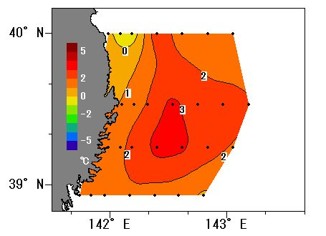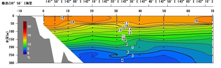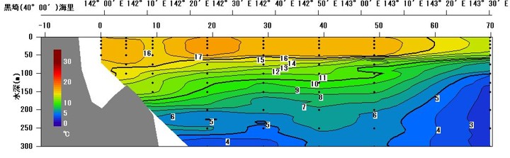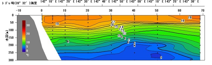 2)5℃以下の水温帯は、黒埼定線の20~30海里定点の300m以深及び70海里定点の150m以深、トドヶ埼及び尾埼定線の10~50海里定点の300m以深並びに椿島定線の20~50海里定点の300m以深に分布していた。