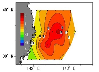 2)10海里以遠の表面水温は、椿島定線の50海里定点で平年並みであり、その他の定点では、1~3℃程度高めであった。100m深水温は、黒埼定線の20海里及び50海里定点、トドヶ埼定線の40~50海里定点、尾埼定線の30海里及び50海里定点並びに椿島定線の20~30海里及び50海里定点で平年並みであり、その他の定点では1~4℃程度高めであった。