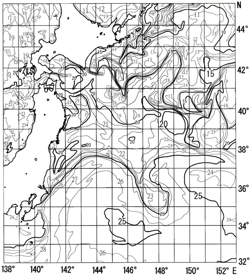 1.本県沿岸10海里(19km)以内の表面水温は、県北部で19~21℃台、県中部及び南部で19~20℃台。先週は、全域で21℃台。なお、前年は、県北部で17~18℃台、県中部及び南部で18~19℃台であった。