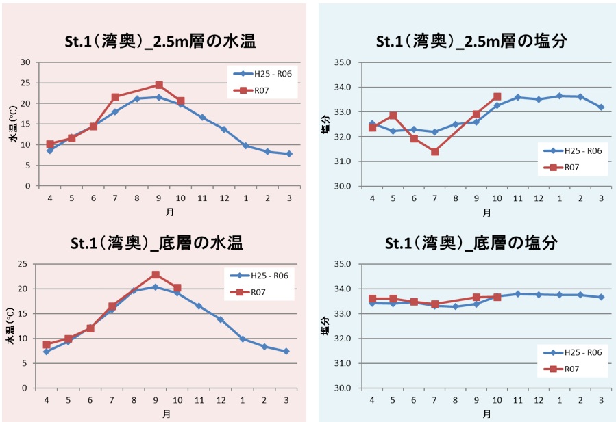 ※水質計で測定した値であり、正確な濃度ではありません。湾内の相対的な比較としてご利用ください(月をまたいでの比較はできません) 。 St.1は水深約10mでした。