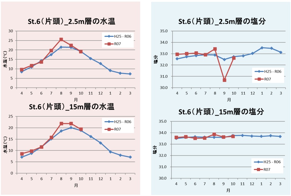 溶存酸素量はSt.1で低い値となり、表層を除く海底までの全層で、水産用水基準値を下回る低酸素状態でした。潮流等で溶存酸素が少ない水塊が湾内を移動することも考えられるので、養殖生産物の状態に注意してください。