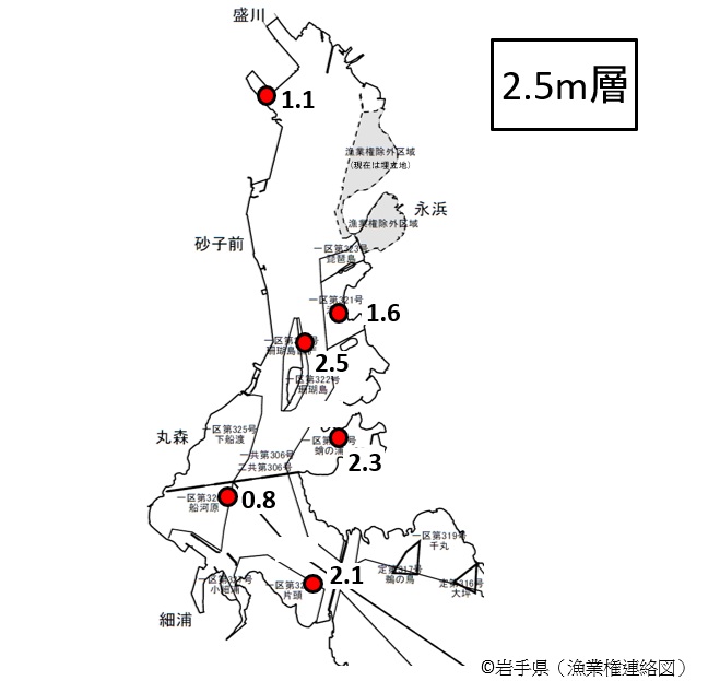 溶存酸素量はSt.1で低い値となり、表層を除く海底までの全層で、水産用水基準値を下回る低酸素状態でした。