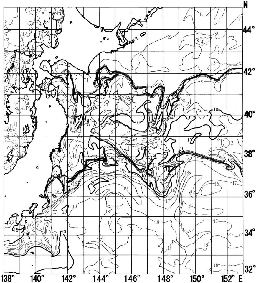 3.10℃以上の水温帯は、塩屋埼から北東方向に分布し、その北端は椿島沖の80海里(148km)にある。なお、前年の同水温帯は、椿島から東北東方向に分布していたほか、ごく小規模な同水温帯が閉伊埼に接岸していた。